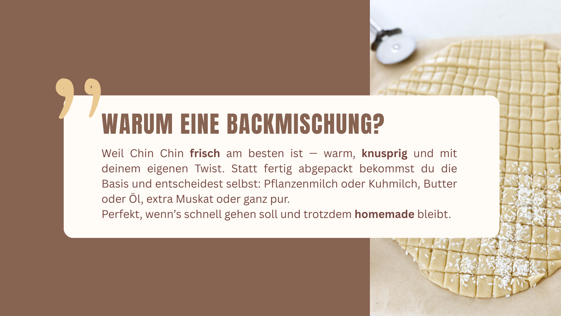 Alles, was du brauchst, ist Milch und Fett deiner Wahl. Schnell verrühren, formen, frittieren oder backen – und schon sind deine Chin-Chin-Cookie-Bites ready to snack!